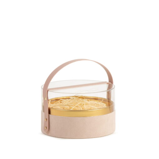 קופסת מתנה עגולה מקרטון עם ידית מכסה אקרילי קוטר 21 גובה 13.5 ס"מ- ורוד כוללת נייר גרוס בפנים