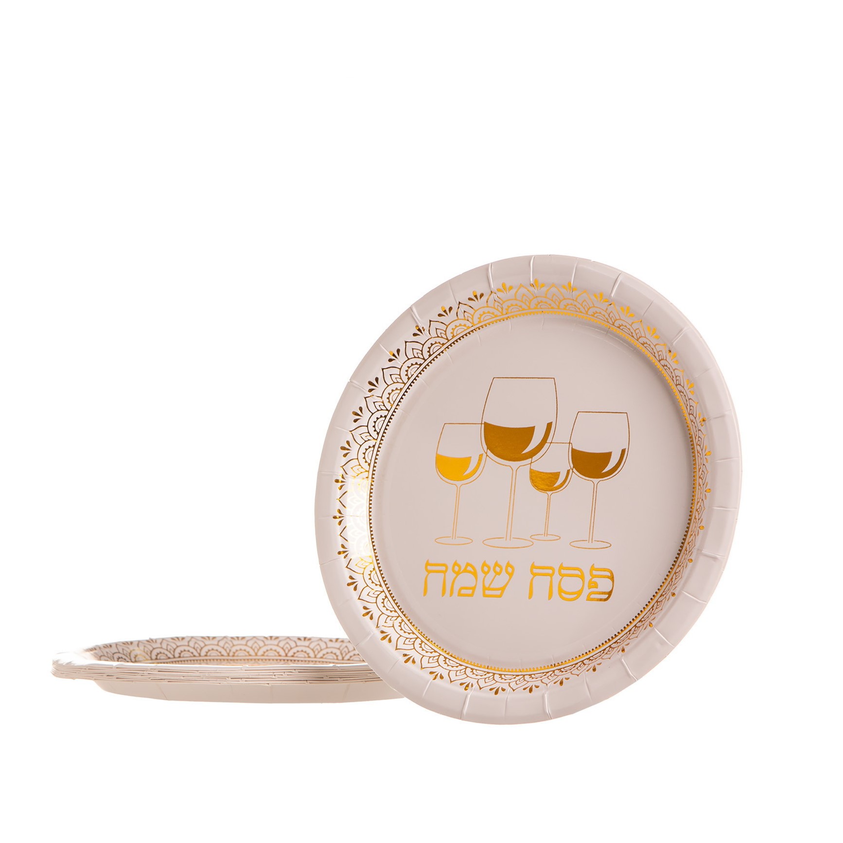 חבילת 10 צלחות נייר 18 ס"מ- פסח שמח ארבע כוסות זהב