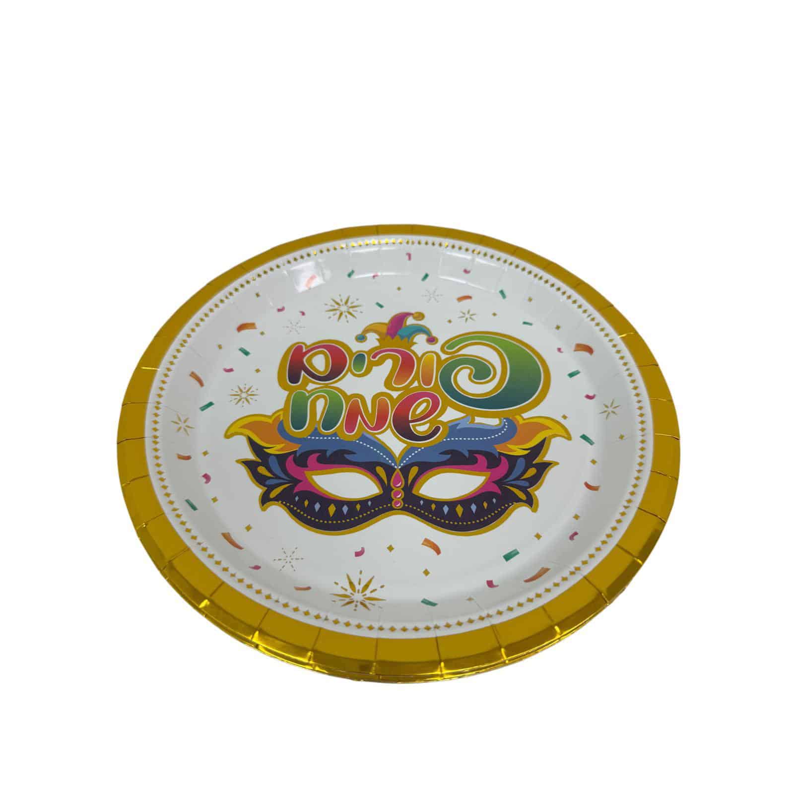 חבילת 10 צלחות נייר 23 ס"מ- פורים שמח דגם מסכה
