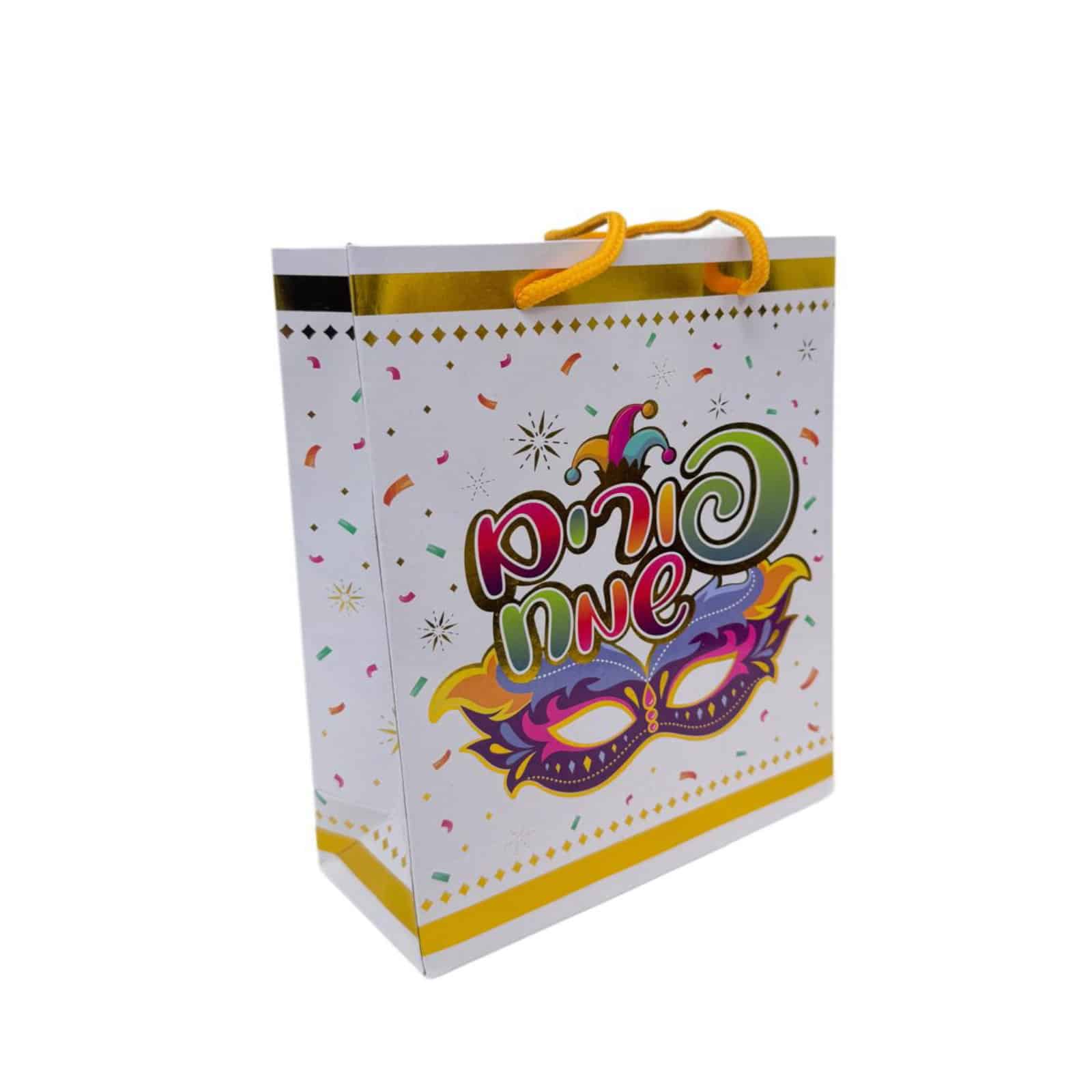 חבילת 12 שקיות נייר- פורים שמח מסכה גובה- 30 ס"מ רוחב- 23 ס"מ אורך- 10 ס"מ