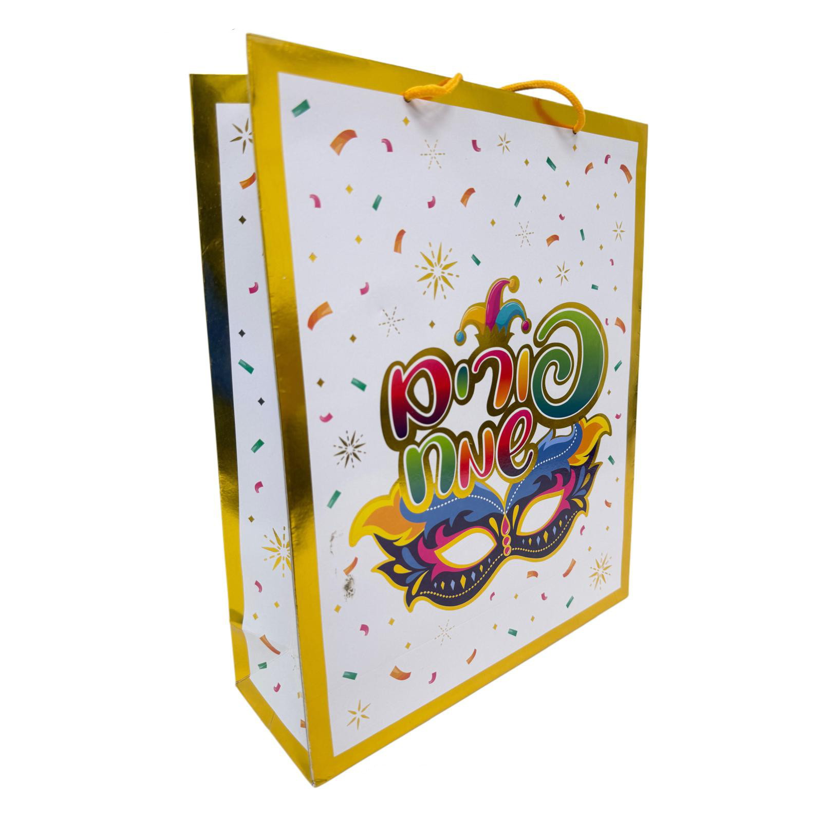 חבילת 12 שקיות נייר- פורים שמח מסכה גובה- 38.5 ס"מ רוחב- 31 ס"מ אורך- 11 ס"מ