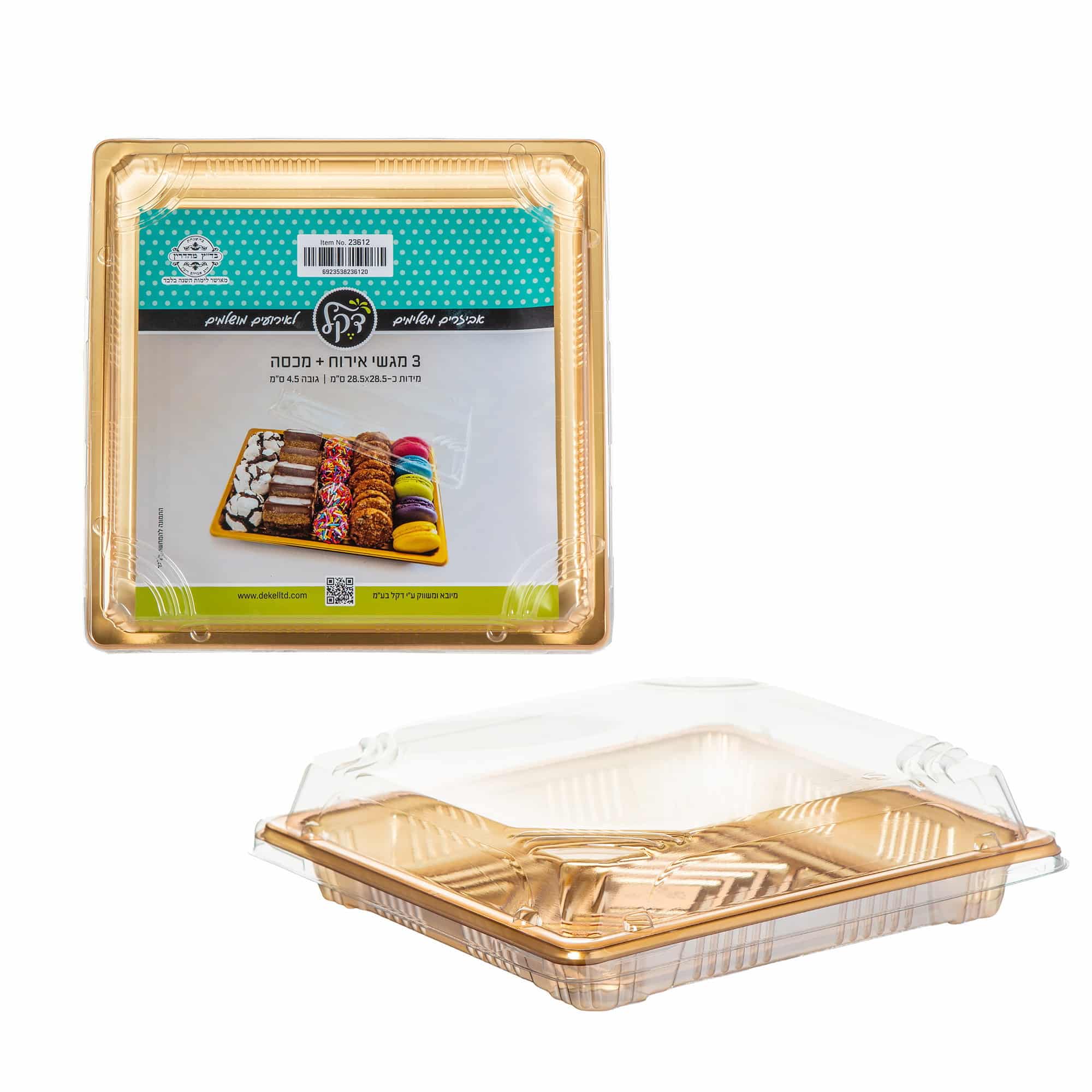 חבילת 3 מגשי סושי זהב+ מכסה רוחב- 28.5 ס"מ אורך- 28.5 ס"מ גובה- 4.5 ס"מ