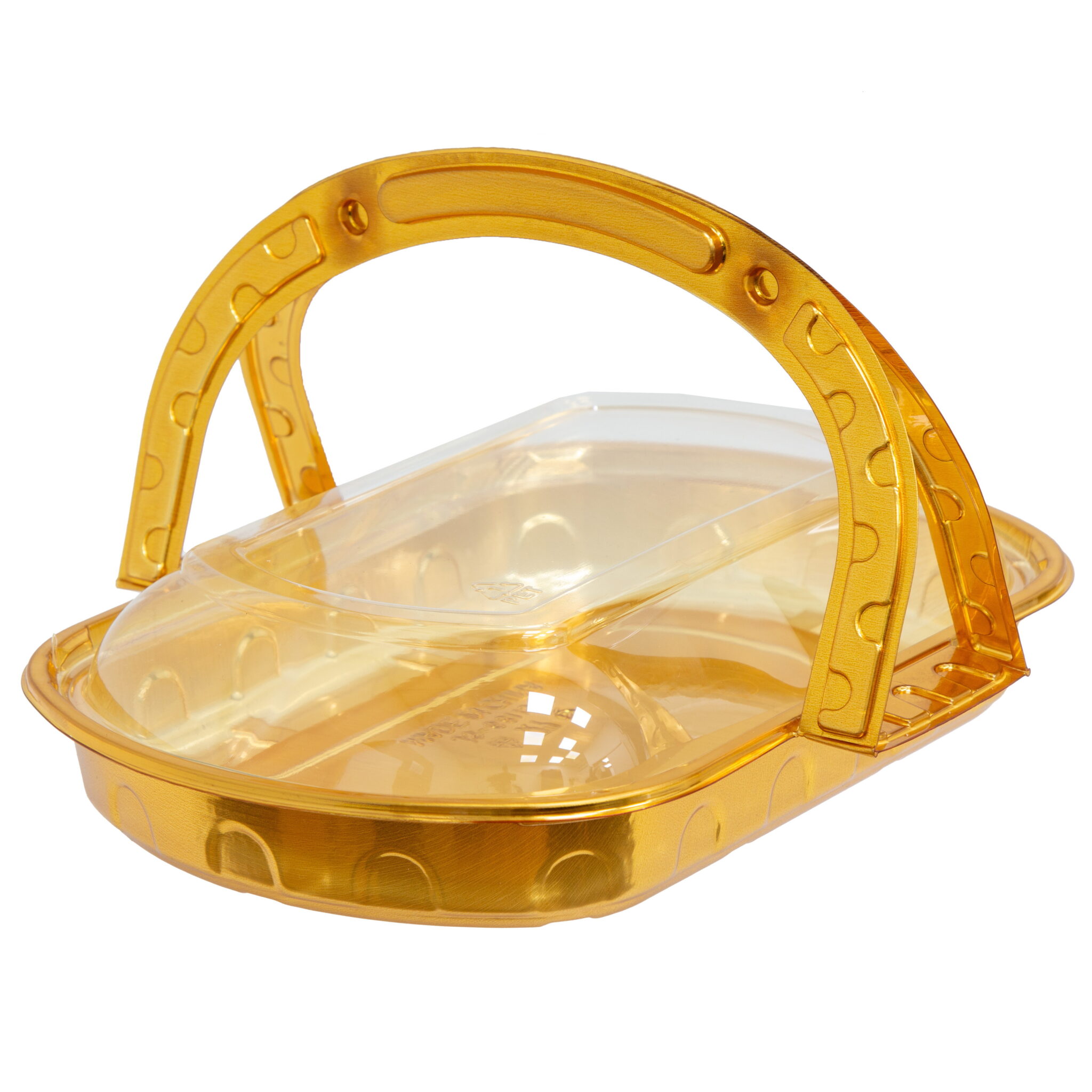 מגש פלסטיק זהב+ מכסה בצורת סלסלה רוחב- 35 ס"מ אורך- 23 ס"מ גובה (כולל מכסה)- 10 ס"מ מגיע 50 יחידות במארז