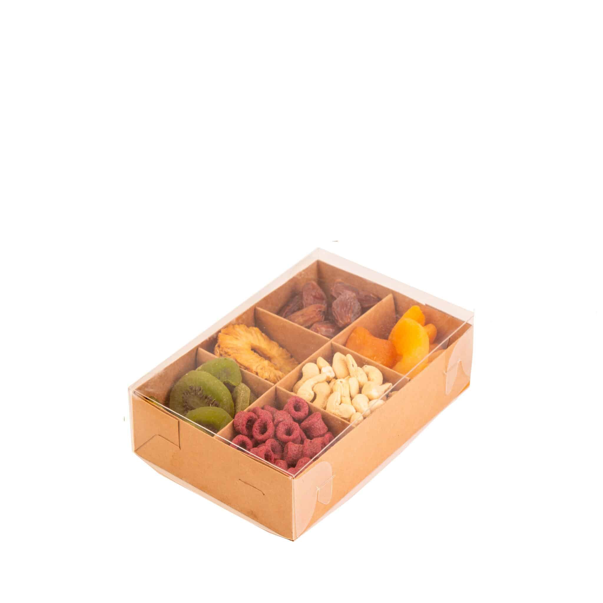 קופסת קרטון מחולקת מכסה PVC שקוף 6 תאים רוחב 13 ואורך 9.5 ס"מ גובה 3 ס"מ- חום