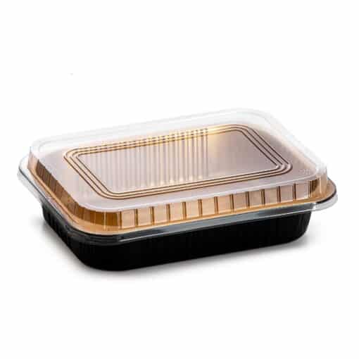 תבניות אלומיניום לאפיה שחור/זהב+מכסה רוחב 27.8 ס"מ אורך 19.7 ס"מ גובה 5.5 ס"מ 2200 מ"ל- מארז 50 יחידות