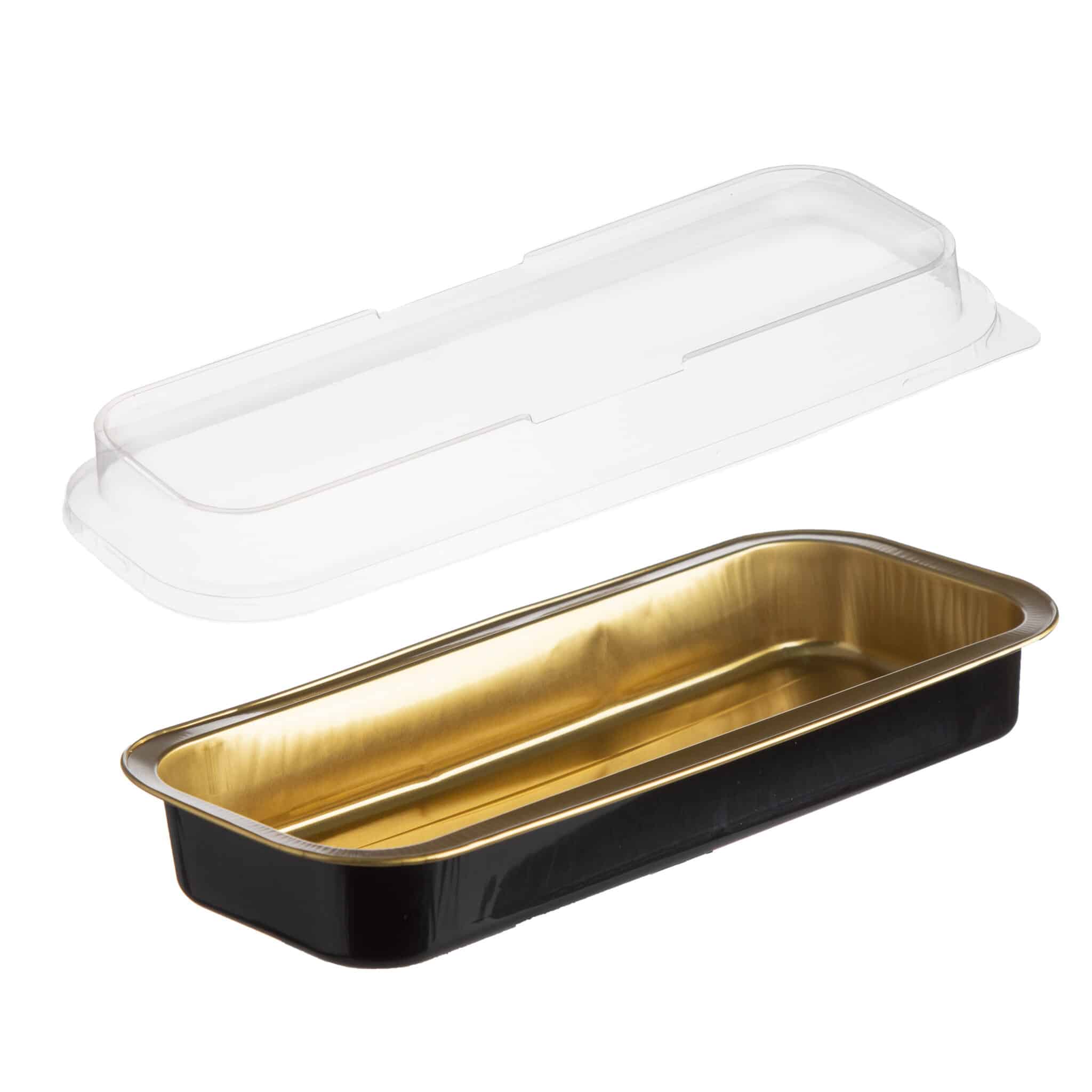 תבניות אלומיניום לאפיה שחור/זהב+מכסה רוחב 33 ס"מ אורך 10 ס"מ גובה 3 ס"מ 650 מ"ל מארז 100 יחידות
