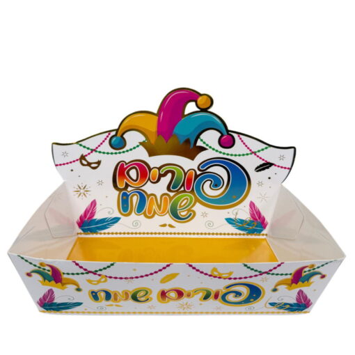 12 מגשי קרטון+ גב- פורים שמח כובע ליצן גובה- 8 ס"מ רוחב- 28 ס"מ אורך- 17 ס"מ