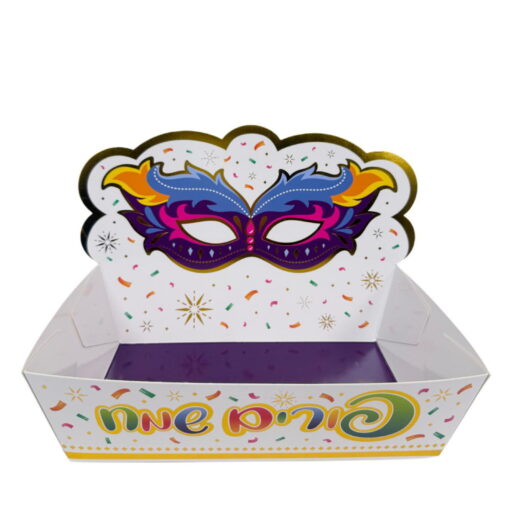 12 מגשי קרטון+ גב- פורים שמח מסכה גובה- 8 ס"מ רוחב- 28 ס"מ אורך- 17 ס"מ