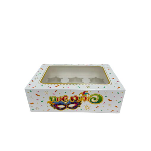 12 קופסאות קרטון ל6 קאפקייקס- פורים שמח מסכה גובה- 8 ס"מ רוחב- 25 ס"מ אורך- 17 ס"מ