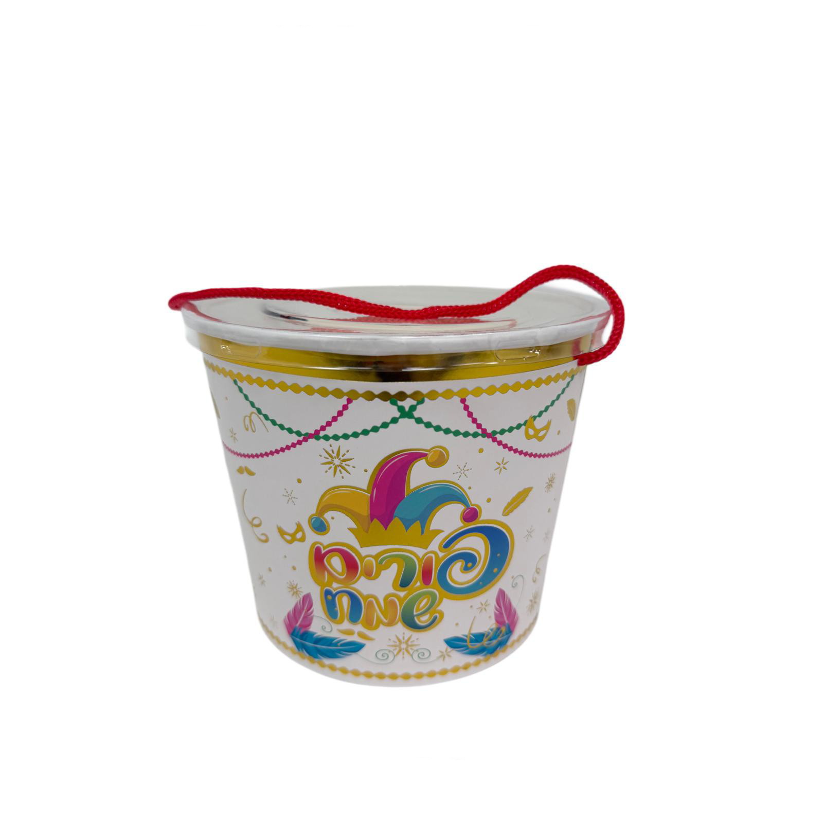 12 קופסאות פופקורן+ שרוך – פורים שמח כובע ליצן קוטר- 16.8 ס"מ גובה- 13.8 ס"מ