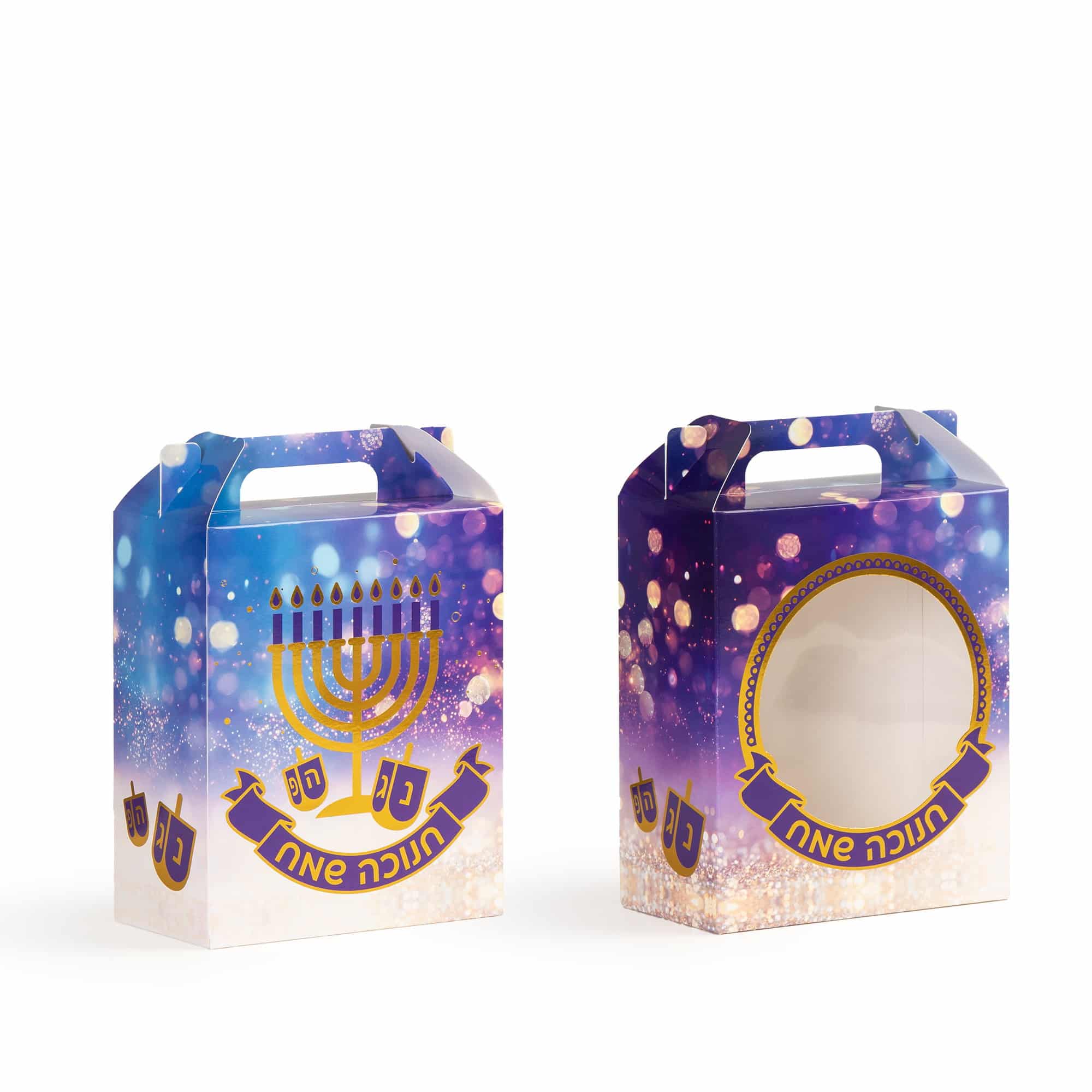 12 קופסאות קרטון+ חלון- חנוכה שמח כחול זהב גובה 18 ס"מ רוחב 15 ס"מ עומק 8 ס"מ