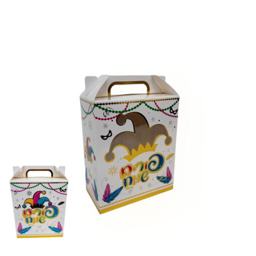 12 קופסאות קרטון+ חלון- פורים שמח כובע ליצן גובה- 18 ס"מ רוחב- 15 ס"מ אורך- 8 ס"מ