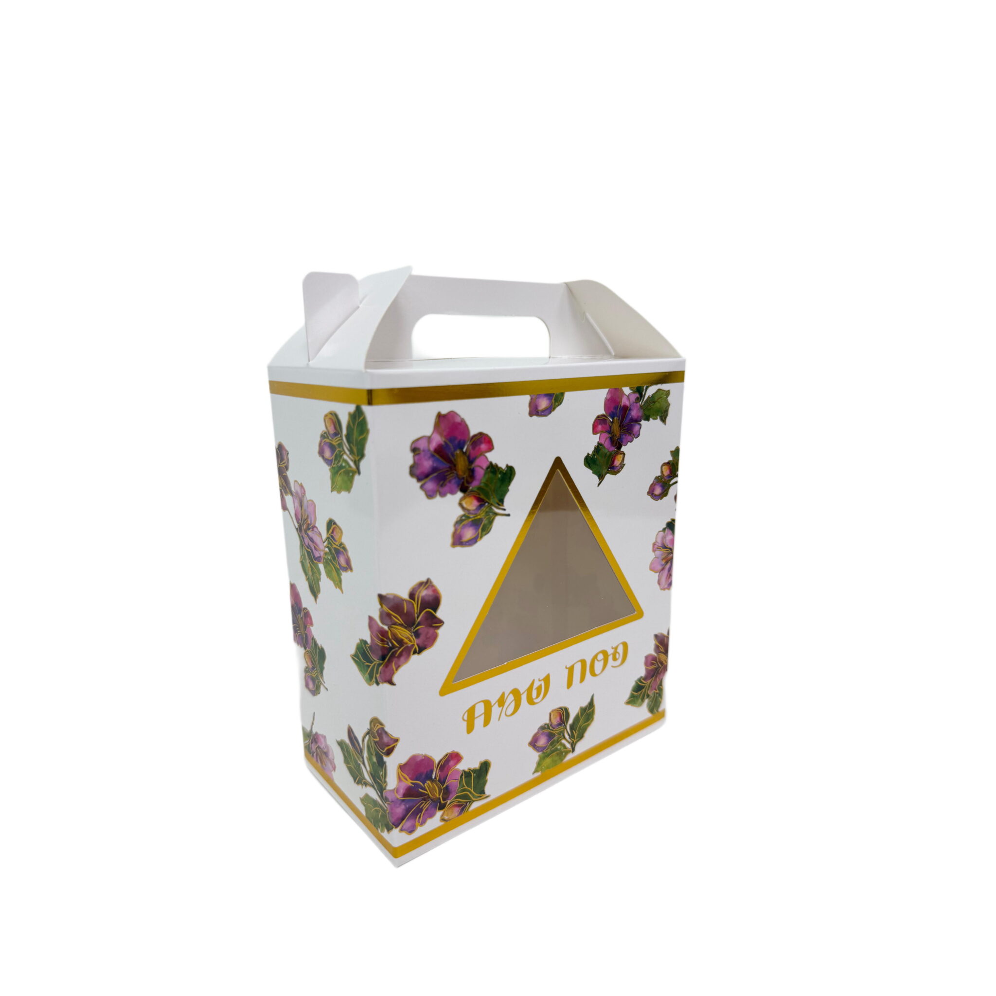 12 קופסאות קרטון+ חלון- פסח שמח פירמידות ופרחים כיתוב זהב גובה- 18 ס"מ רוחב- 15 ס"מ אורך- 8 ס"מ