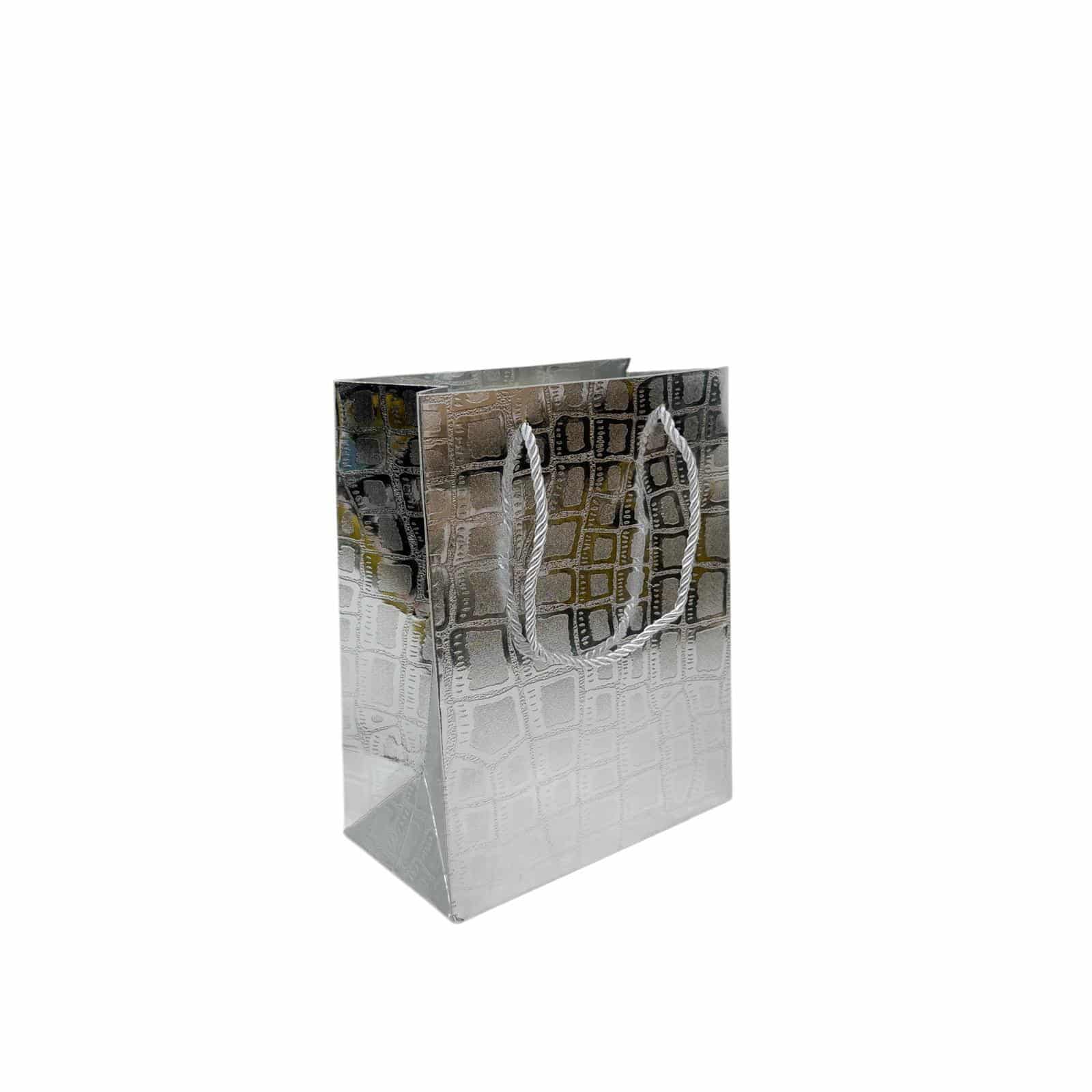 12 שקיות נייר דמוי עור כסף מטאלי גובה 23 ס”מ רוחב 18 ס”מ עומק 10 ס”מ