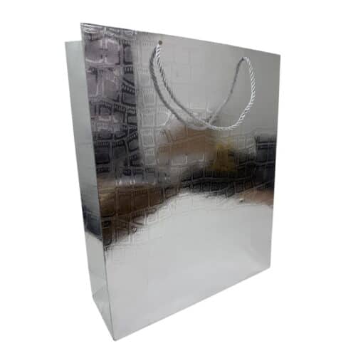 12 שקיות נייר דמוי עור כסף מטאלי גובה 38 ס”מ רוחב 31 ס”מ עומק 11 ס”מ