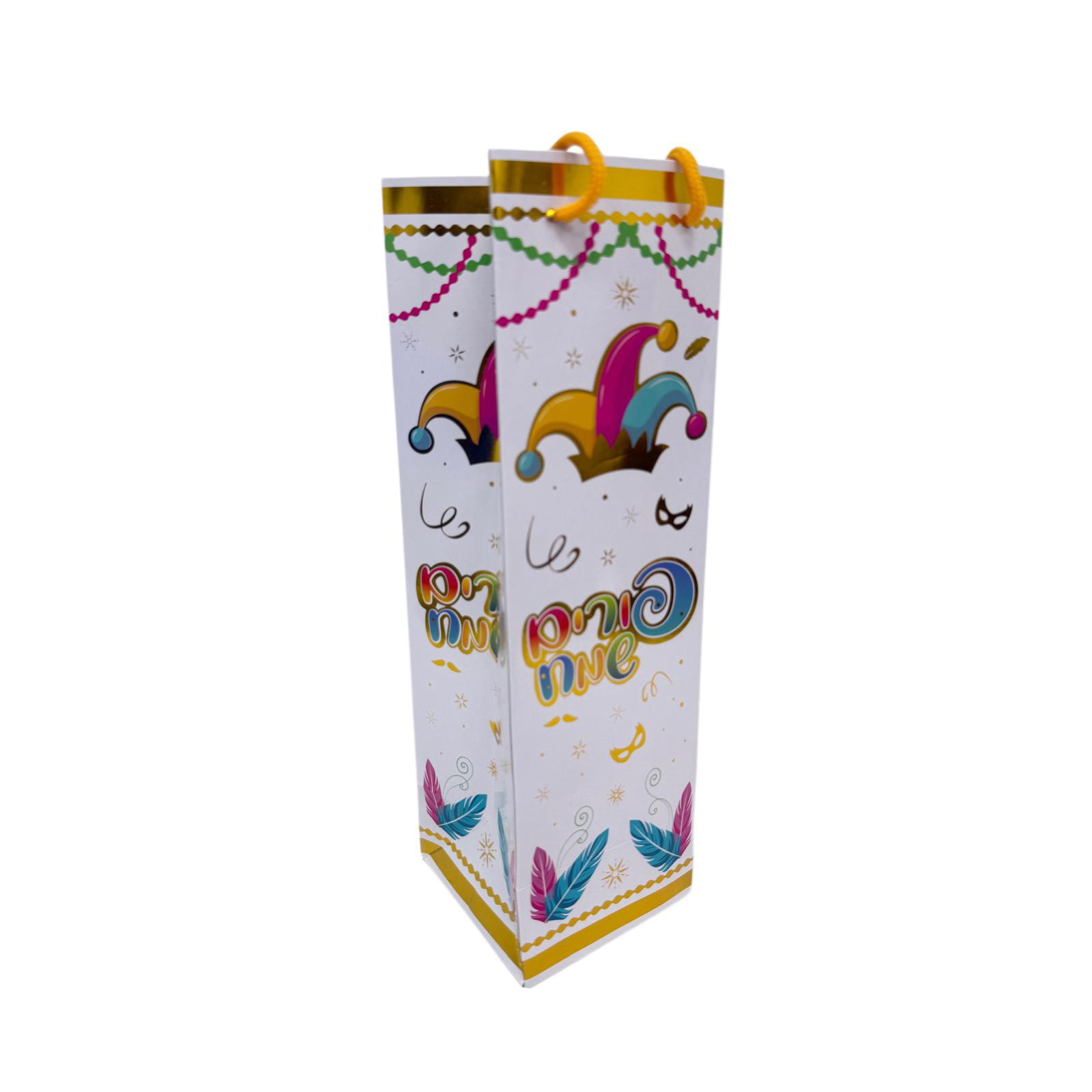 חבילת 12 שקיות נייר לבקבוק יין- פורים שמח כובע ליצן גובה- 36 ס"מ רוחב- 11 ס"מ אורך- 11 ס"מ