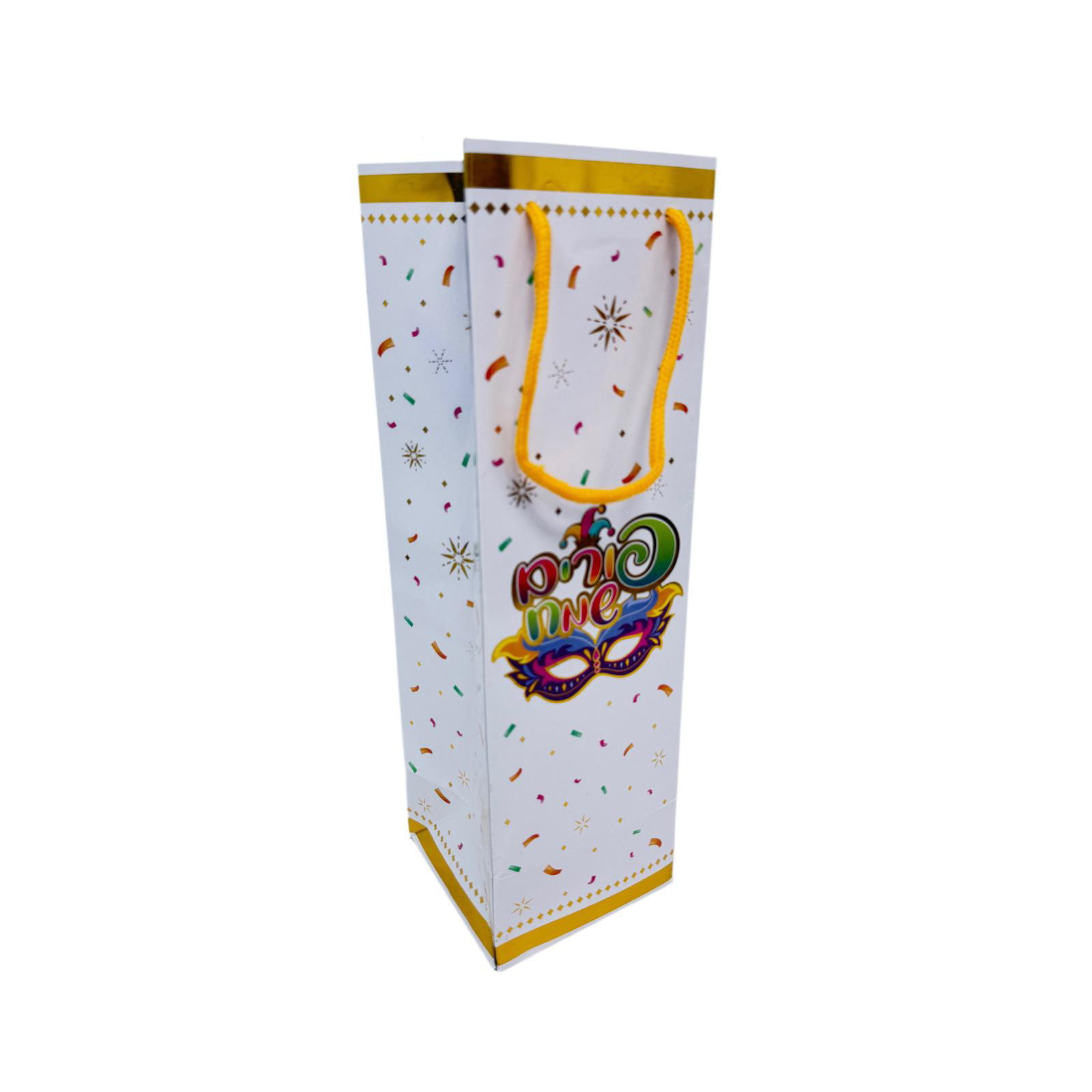 חבילת 12 שקיות נייר לבקבוק יין- פורים שמח מסכה גובה- 36 ס"מ רוחב- 11 ס"מ אורך- 11 ס"מ