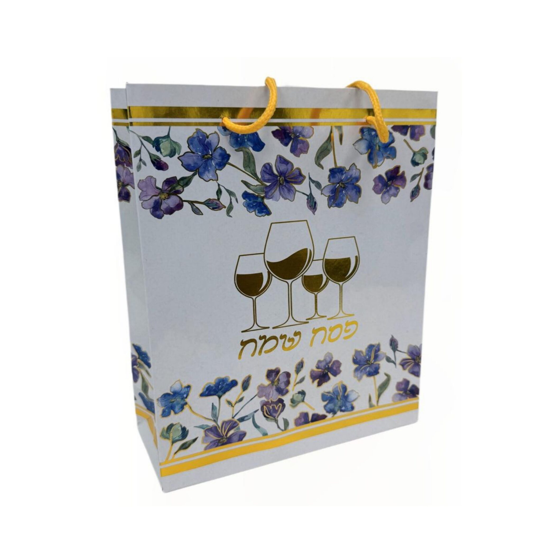 12 שקיות נייר גובה 30 ס"מ רוחב 23 ס"מ עומק 10 ס"מ -פסח שמח ארבע כוסות ופרחים כיתוב זהב