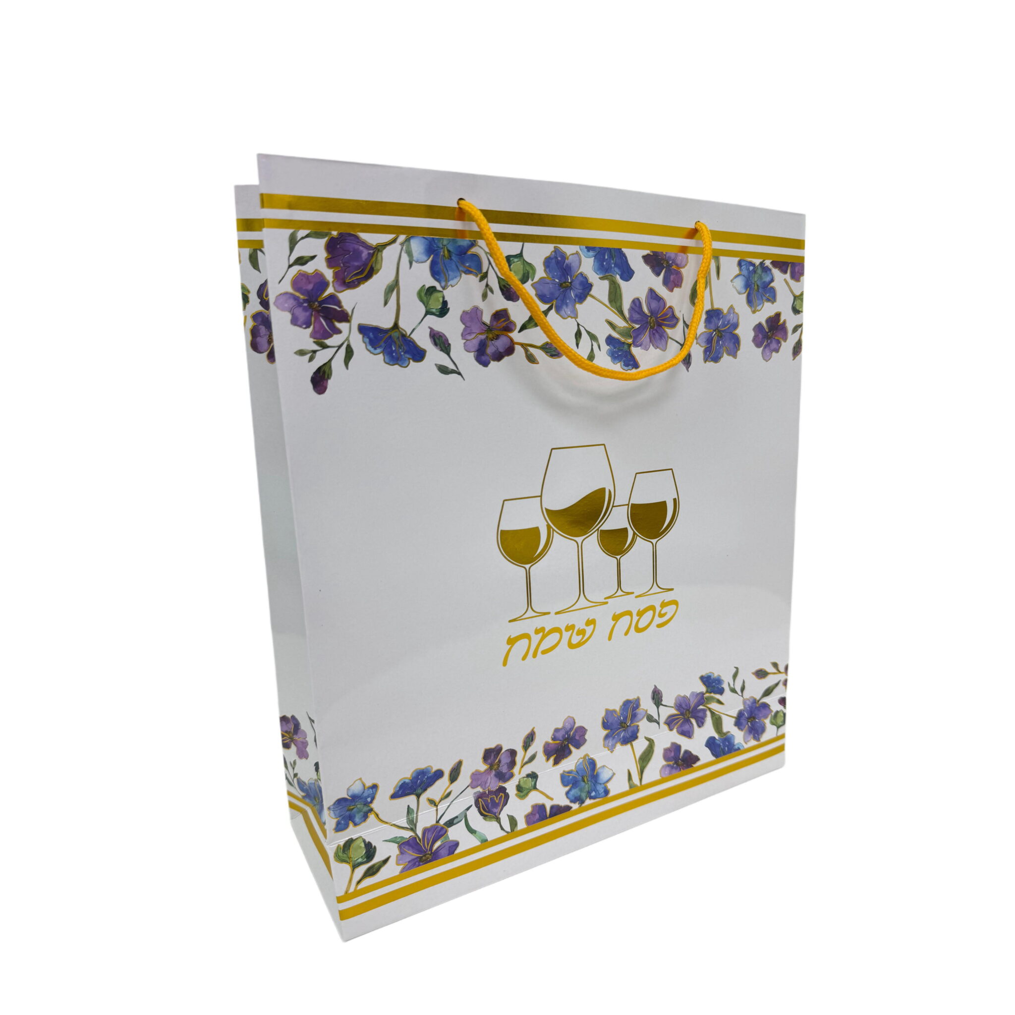 12 שקיות נייר גובה 38.5 ס"מ רוחב 31.5 ס"מ עומק 11 ס"מ -פסח שמח ארבע כוסות ופרחים כיתוב זהב