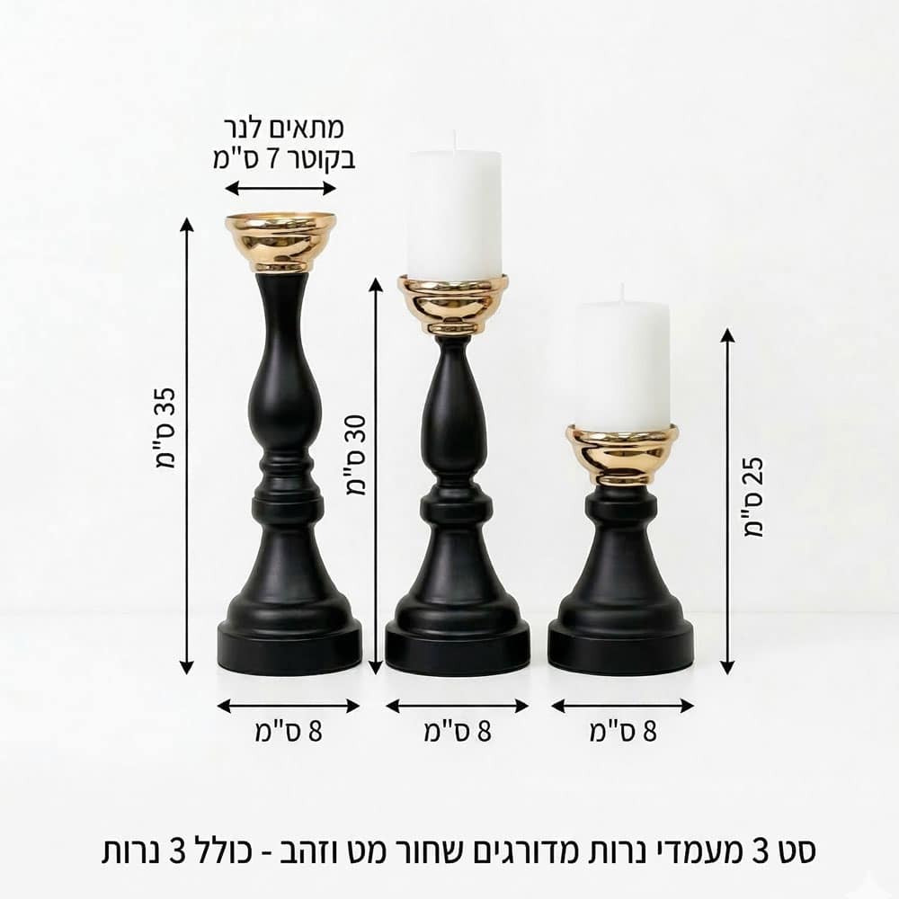 שדרגו את האווירה בבית עם סט יוקרתי ומעוצב, המשלב גימור שחור מט אלגנטי עם סיומת זהב מבריקה. הסט מגיע עם שלושה נרות לבנים איכותיים, המוכנים להדלקה.